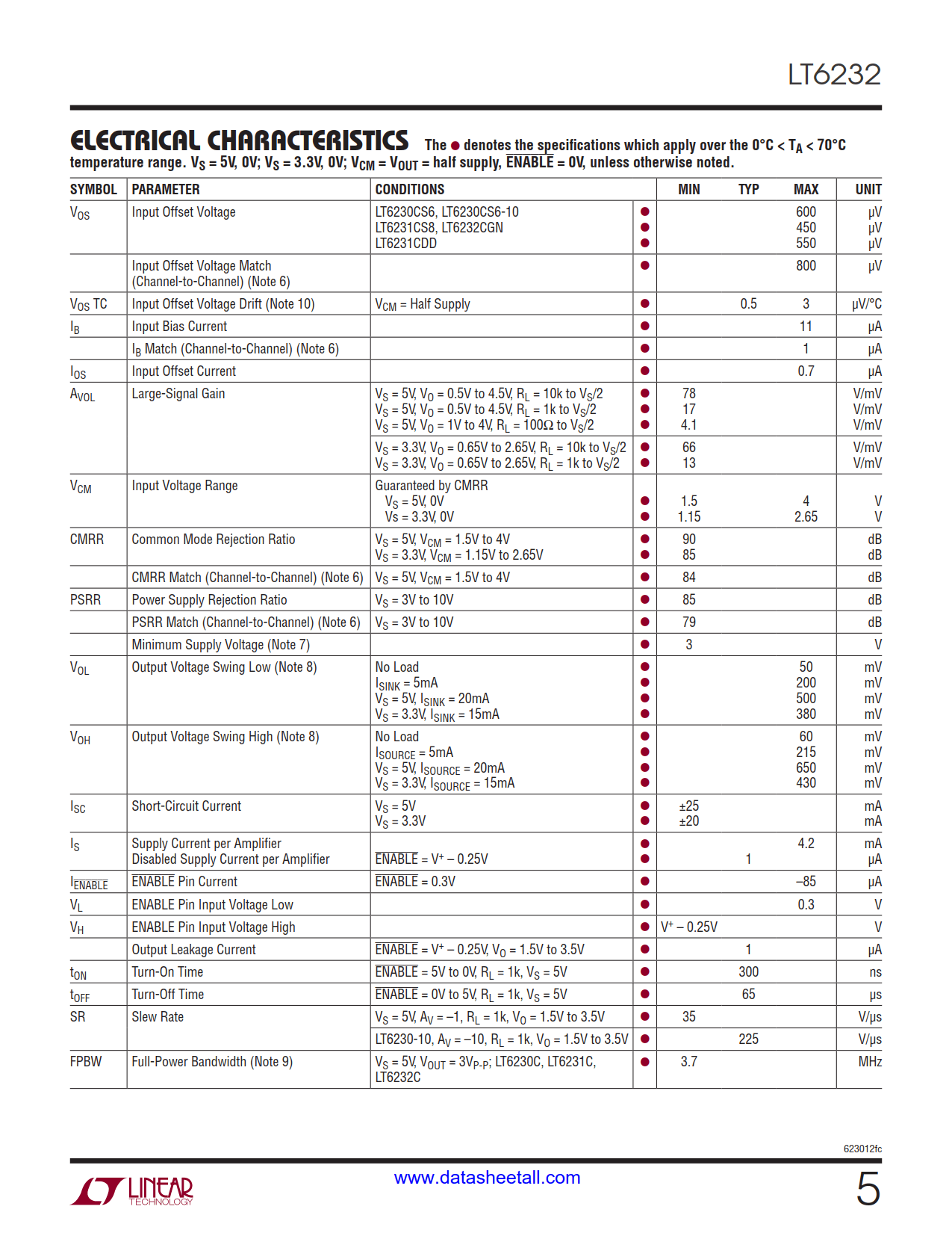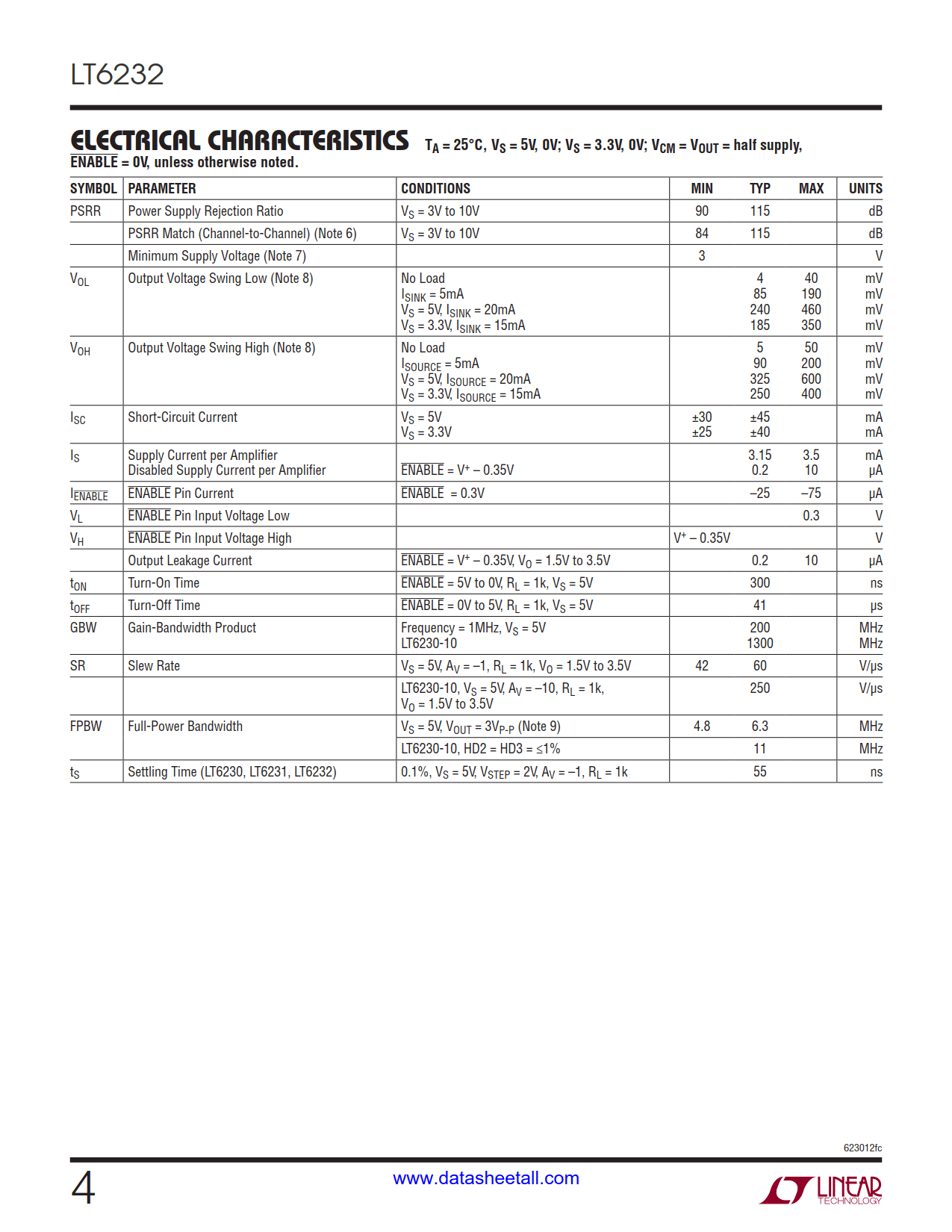 The amplifier family has an output that swings within 50mV of either supply rail to maximize the signal dynamic range in low supply applications and is specified on 3.3V, 5V and ±5V supplies. The en • √ISUPPLY product of 1.9 per amplifier is among the most noise efficient of any op amp.