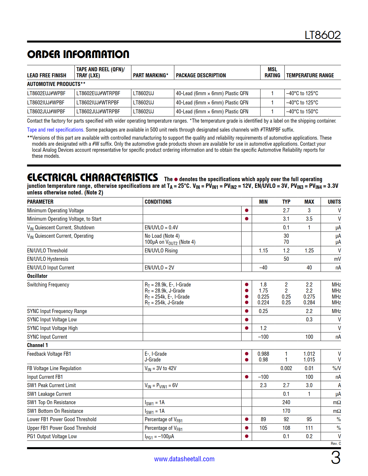 The LT8602 is available in either a 40-lead 6mm × 6mm QFN or a 48-Lead 7mm × 7mm LQFP package.