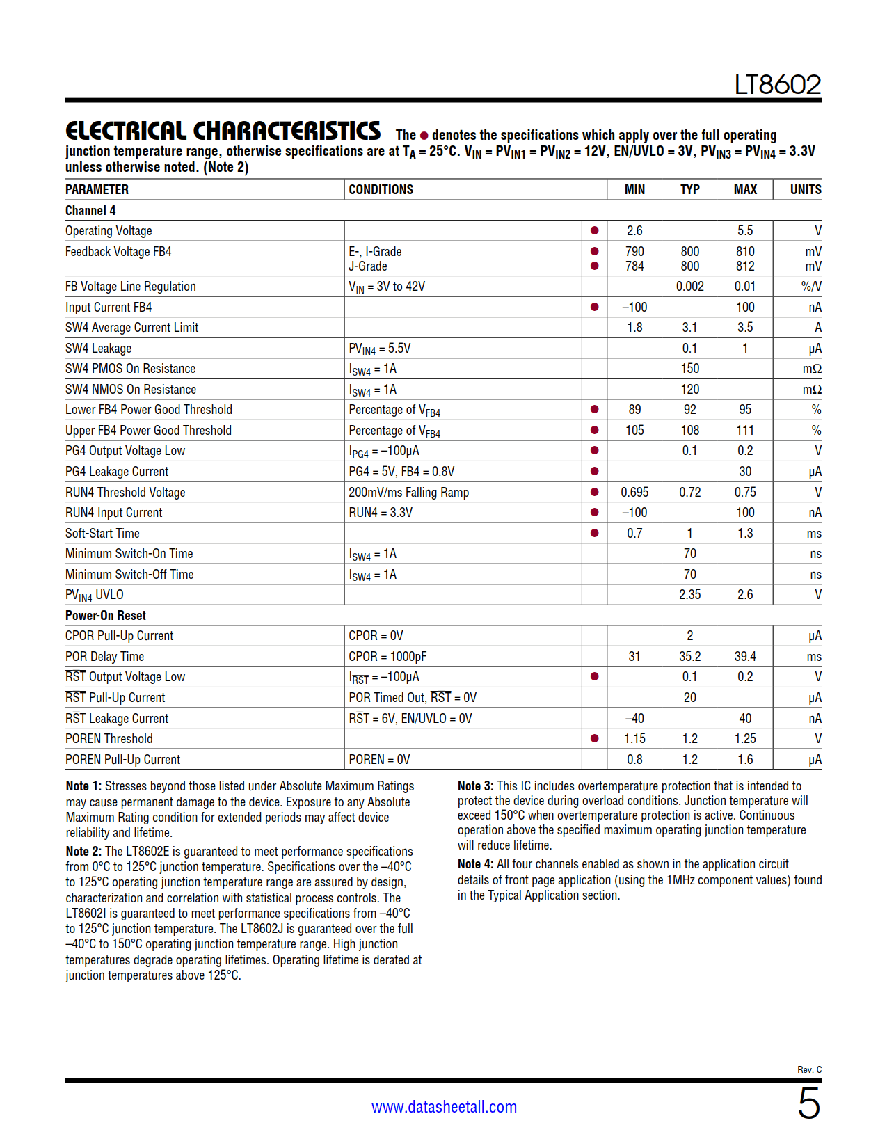 The high voltage channels are synchronous buck regulators that operate from an input of 3V to 42V. The output currents are up to 1.5A (OUT1) and 2.5A (OUT2). The low voltage channels operate from an input of 2.6V to 5.5V. Internal synchronous power switches provide high efficiency with output currents up to 1.8A. The LT8602 uses a 2-phase clock with channels 1 and 3 operating 180° from channels 2 and 4 to reduce input ripple current on both HV and LV inputs. All channels have cycle-by-cycle current limit, providing protection against shorted outputs. Thermal shutdown provides additional protection