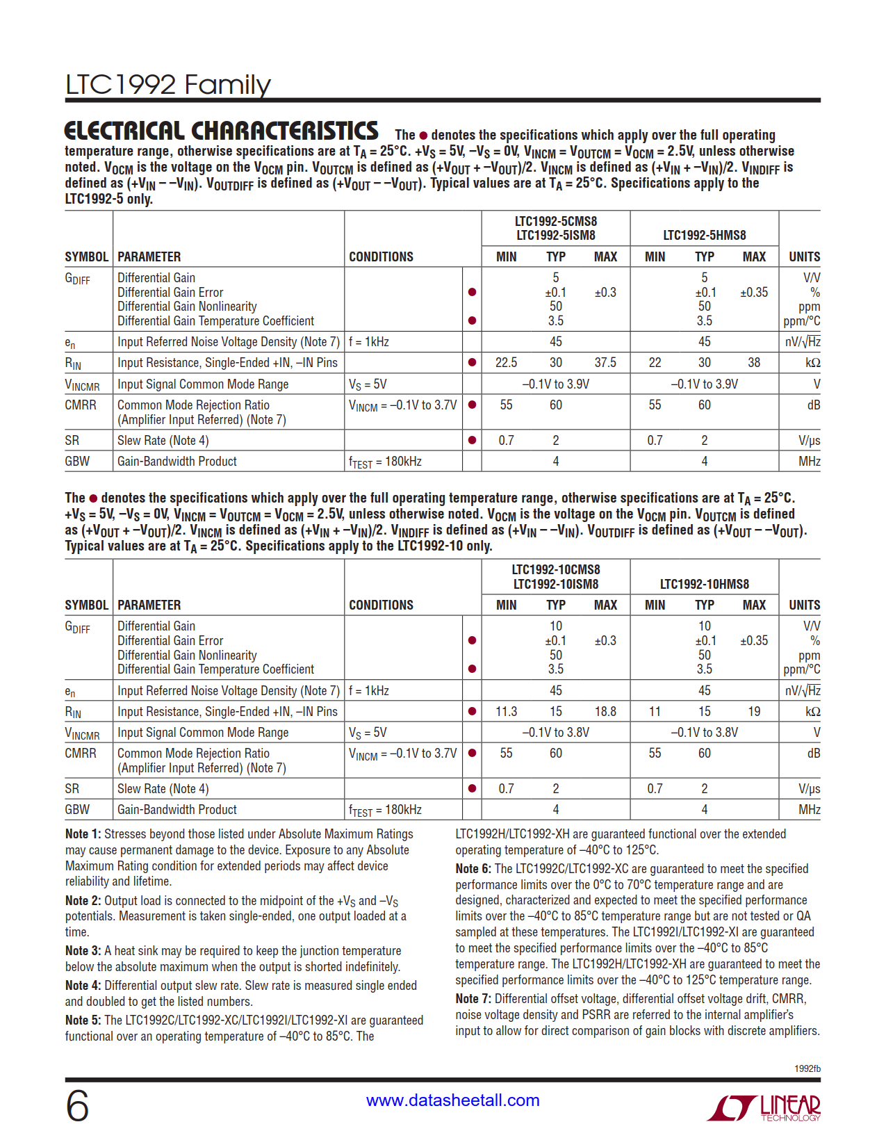 The LTC1992 product family consists of five fully differential, low power amplifiers. The LTC1992 is an unconstrained fully differential amplifier. The LTC1992-1, LTC1992-2, LTC1992-5 and LTC1992-10 are fixed gain blocks (with gains of 1, 2, 5 and 10 respectively) featuring precision on-chip resistors for accurate and ultrastable gain. All of the LTC1992 parts have a separate internal common mode feedback path for outstanding output phase balancing and reduced second order harmonics. The VOCM pin sets the output common mode level independent of the input common mode level. This feature makes level shifting of signals easy.