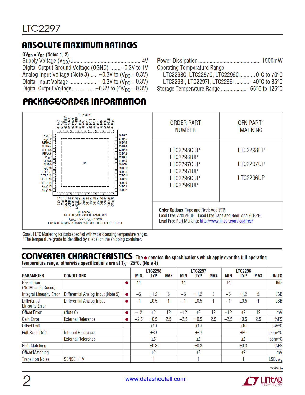 DC specs include ±1.2LSB INL (typ), ±0.5LSB DNL (typ) and no missing codes over temperature. The transition noise is a low 1LSBRMS.