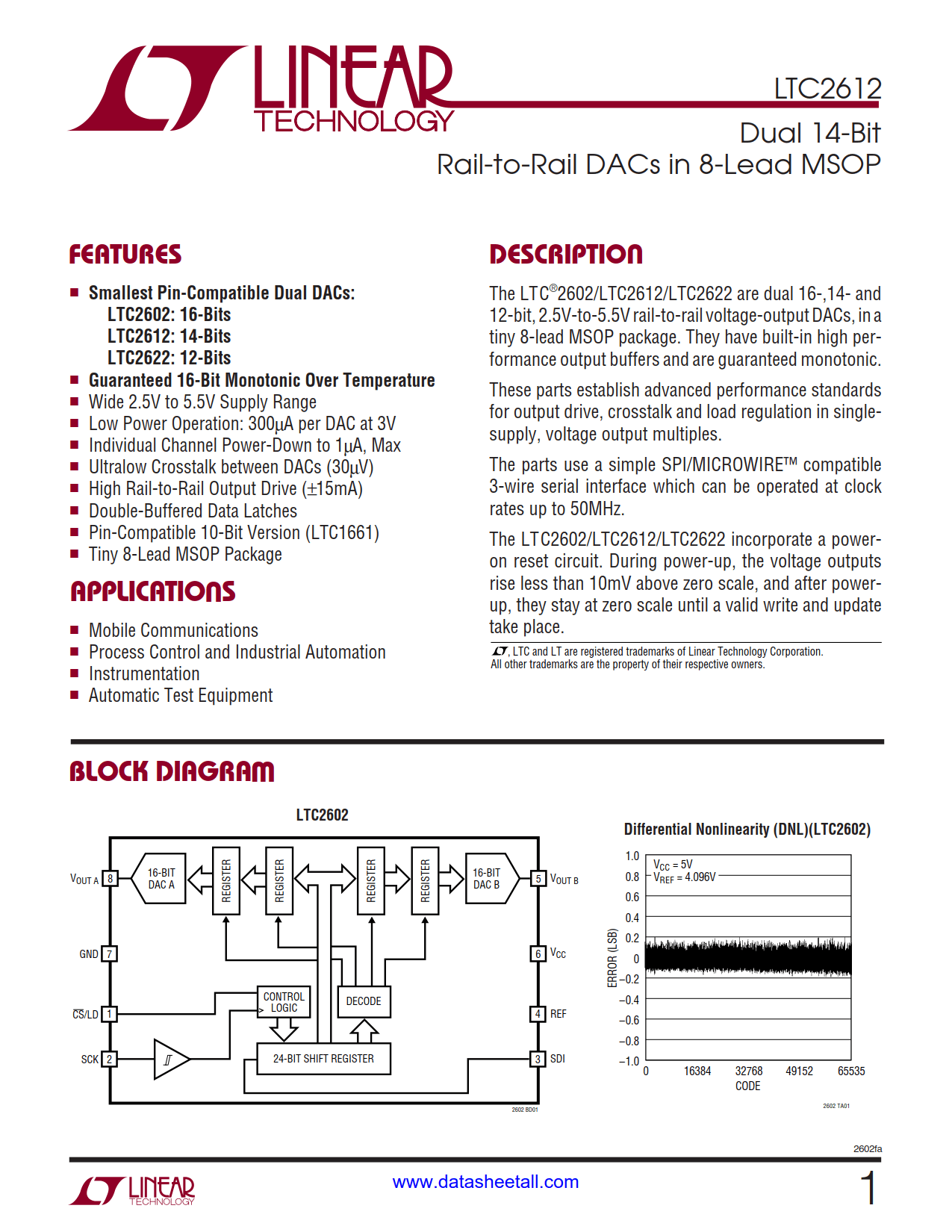 The LTC2612 are dual 14-bit, 2.5V-to-5.5V rail-to-rail voltage-output DACs, in a tiny 8-lead MSOP package. They have built-in high performance output buffers and are guaranteed monotonic.