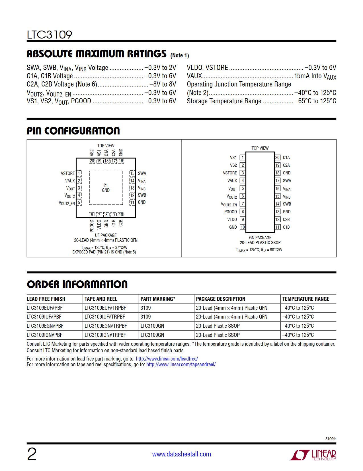 The LTC3109 is available in a small, thermally enhanced 20-lead (4mm × 4mm) QFN package and a 20-lead SSOP package.
