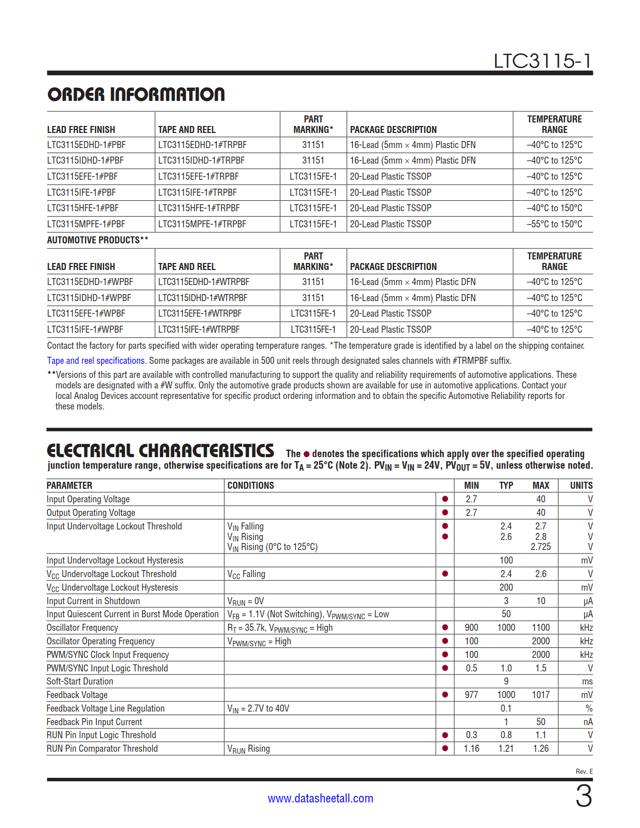 Programmable frequency PWM mode operation provides low noise, high efficiency operation and the ability to synchronize switching to an external clock. Switching frequencies up to 2MHz are supported to allow use of small value inductors for miniaturization of the application circuit. Pin selectable Burst Mode operation reduces standby current and improves light load efficiency which, combined with a 3µA shutdown current, make the LTC3115-1 ideally suited for battery-powered applications. Additional features include output disconnect in shutdown, short-circuit protection and internal soft-start. The LTC3115-1 is available in thermally enhanced 16-lead 4mm × 5mm × 0.75mm DFN and 20-lead TSSOP packages.