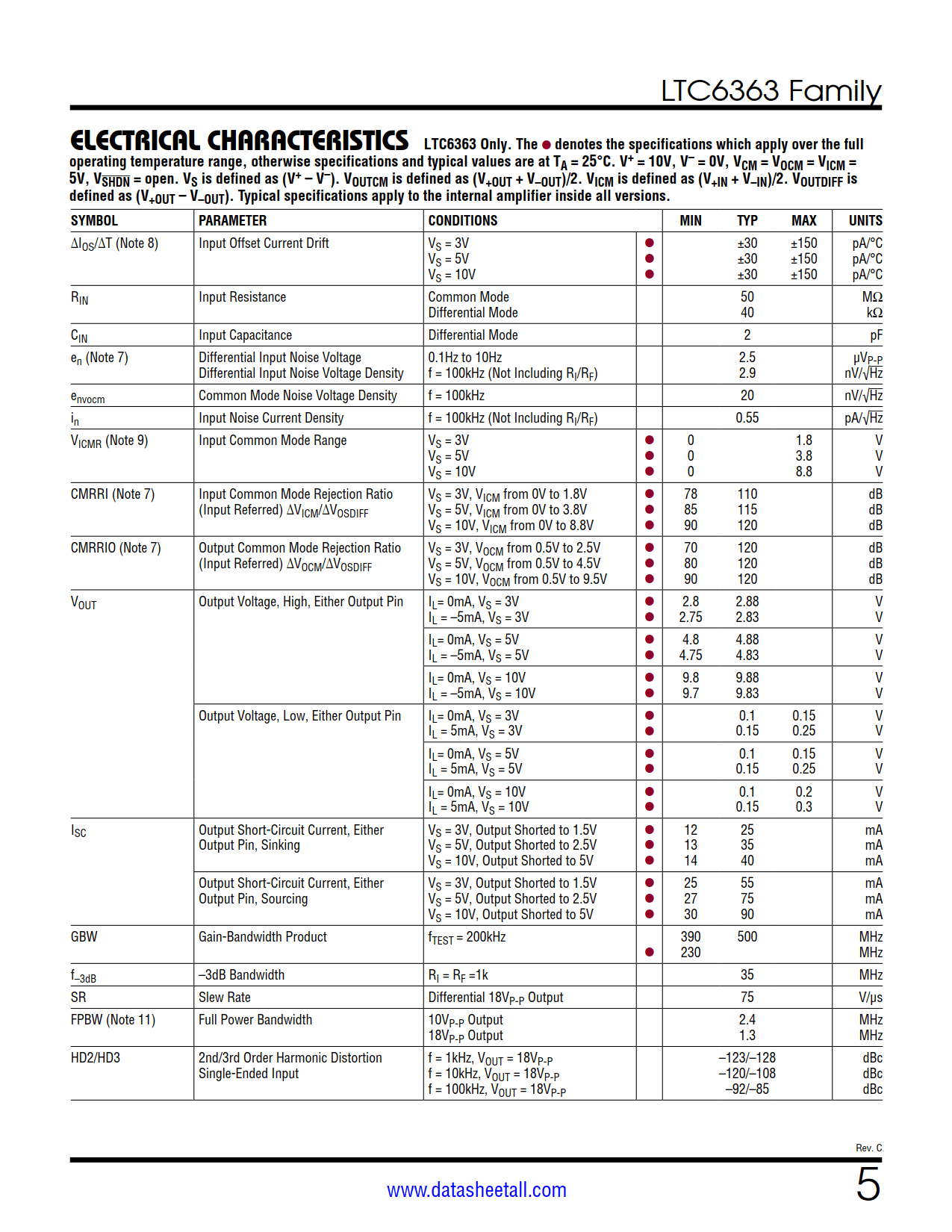 The LTC6363 family consists of four fully differential, low power, low noise amplifiers with rail-to-rail outputs optimized to drive SAR ADCs. The LTC6363 is a standalone differential amplifier, where the gain is typically set using four external resistors. The LTC6363-0.5, LTC6363-1, and LTC6363-2 each have internal matched resistors to create fixed gain blocks with gains of 0.5V/V, 1V/V, and 2V/V respectively. Each of the fixed-gain amplifiers features precision laser trimmed on-chip resistors for accurate, ultrastable gain and excellent CMRR.