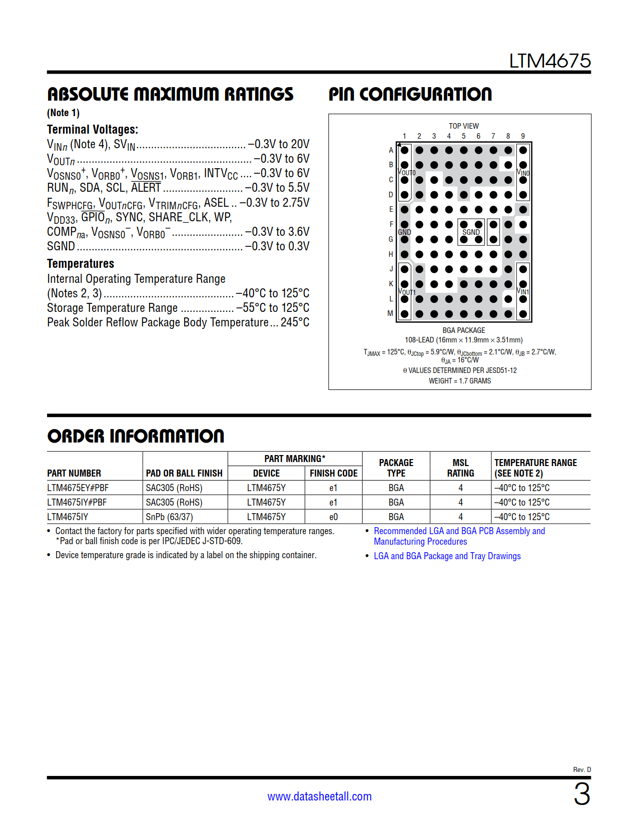 The LTM4675 is offered in a 16mm × 11.9mm × 3.51mm BGA package available with SnPb or RoHS compliant terminal finish.